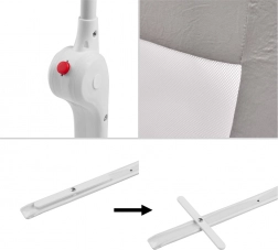 Když zábrana není potřeba, snadno ji složíte pomocí postranních tlačítek, takže nebude vyčnívat nad úroveň matrace. Pevná konstrukce kombinuje odolný kov s vysoce kvalitním plastem, což zajišťuje stabilitu každou noc a odolává i většímu zatížení. Klidný spánek bez obav – pro vás i vaše dítě!