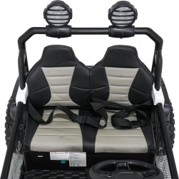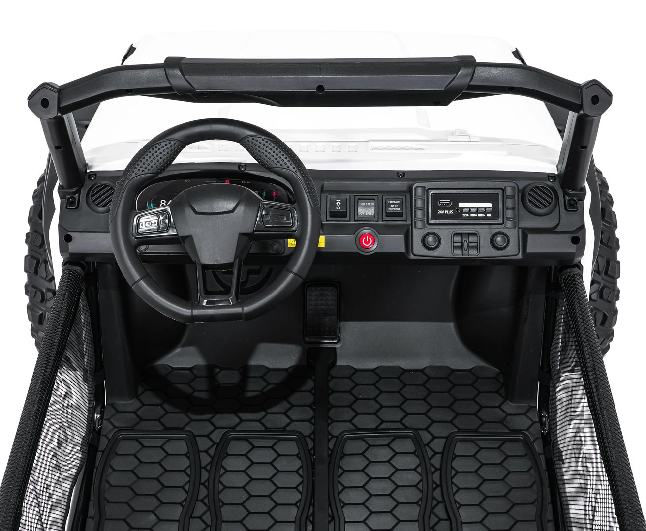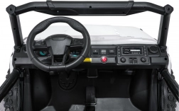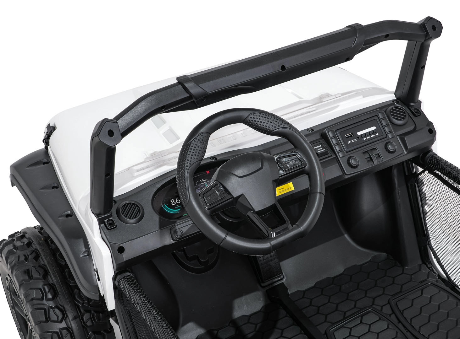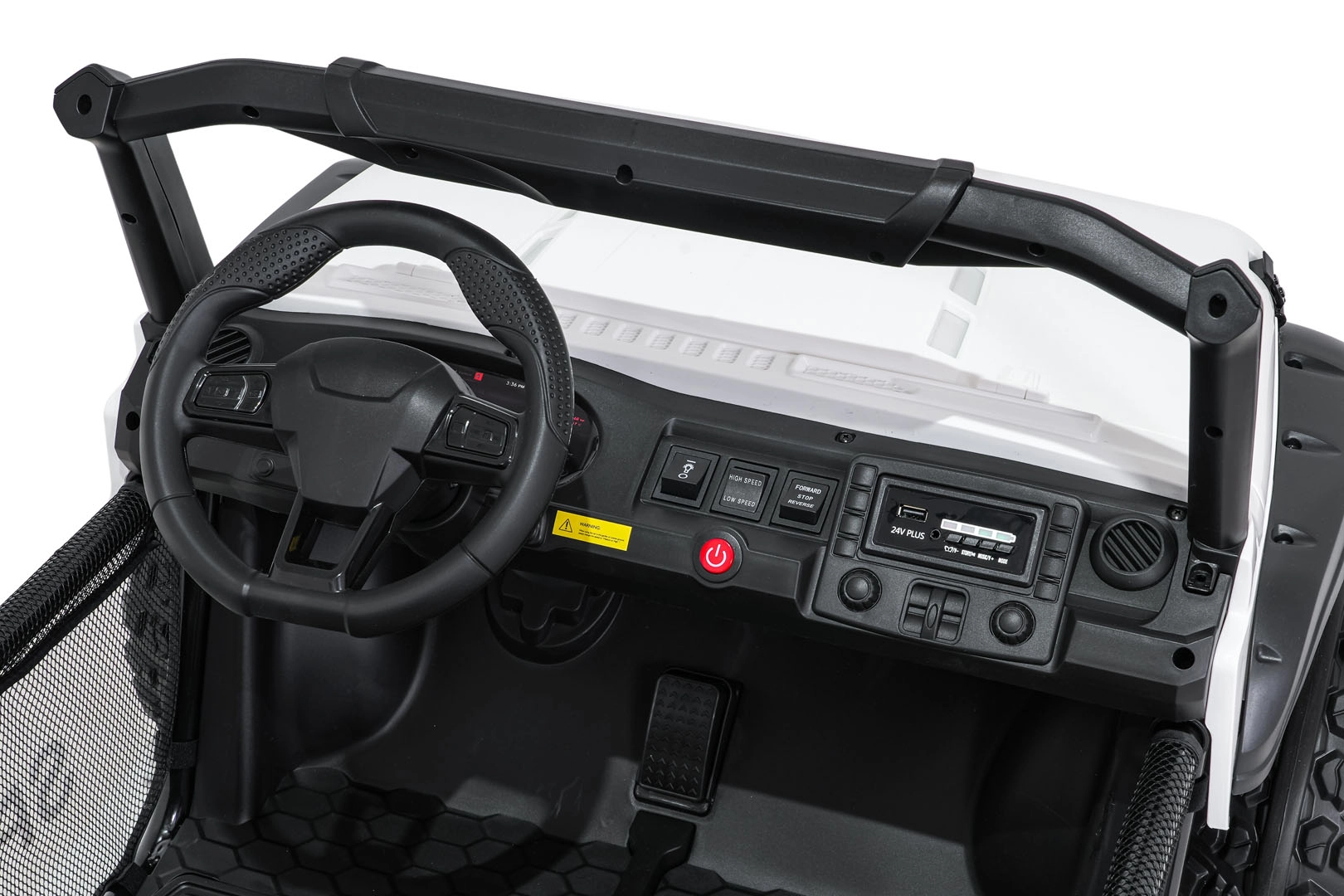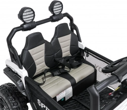 Mladé řidiče potěší bohatá výbava: multimediální panel s MP3/USB/AUX a Bluetooth, zvuky a klakson na volantu, LED přední světla a podsvětlená kapota. Rodiče ocení ovladač 2,4 GHz se 3 rychlostmi, plynulý start a bezpečnostní Stop. Dvoumístné sedadlo z ekokůže s pásy zvyšuje komfort a bezpečí.