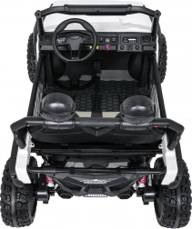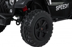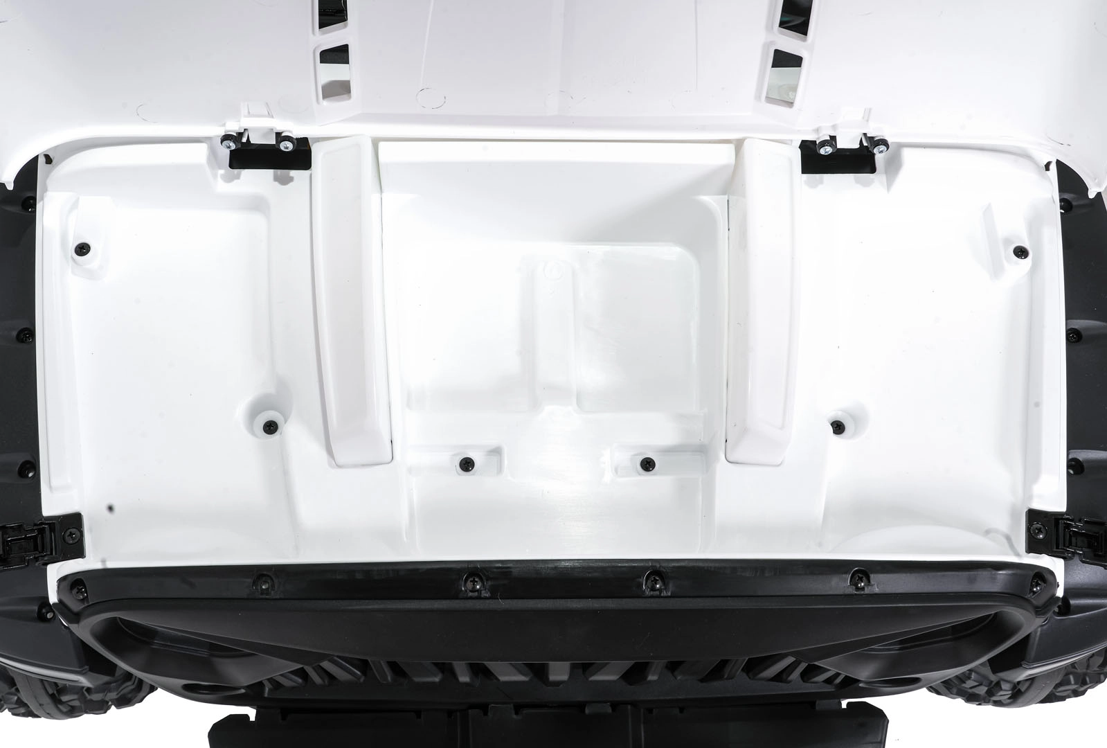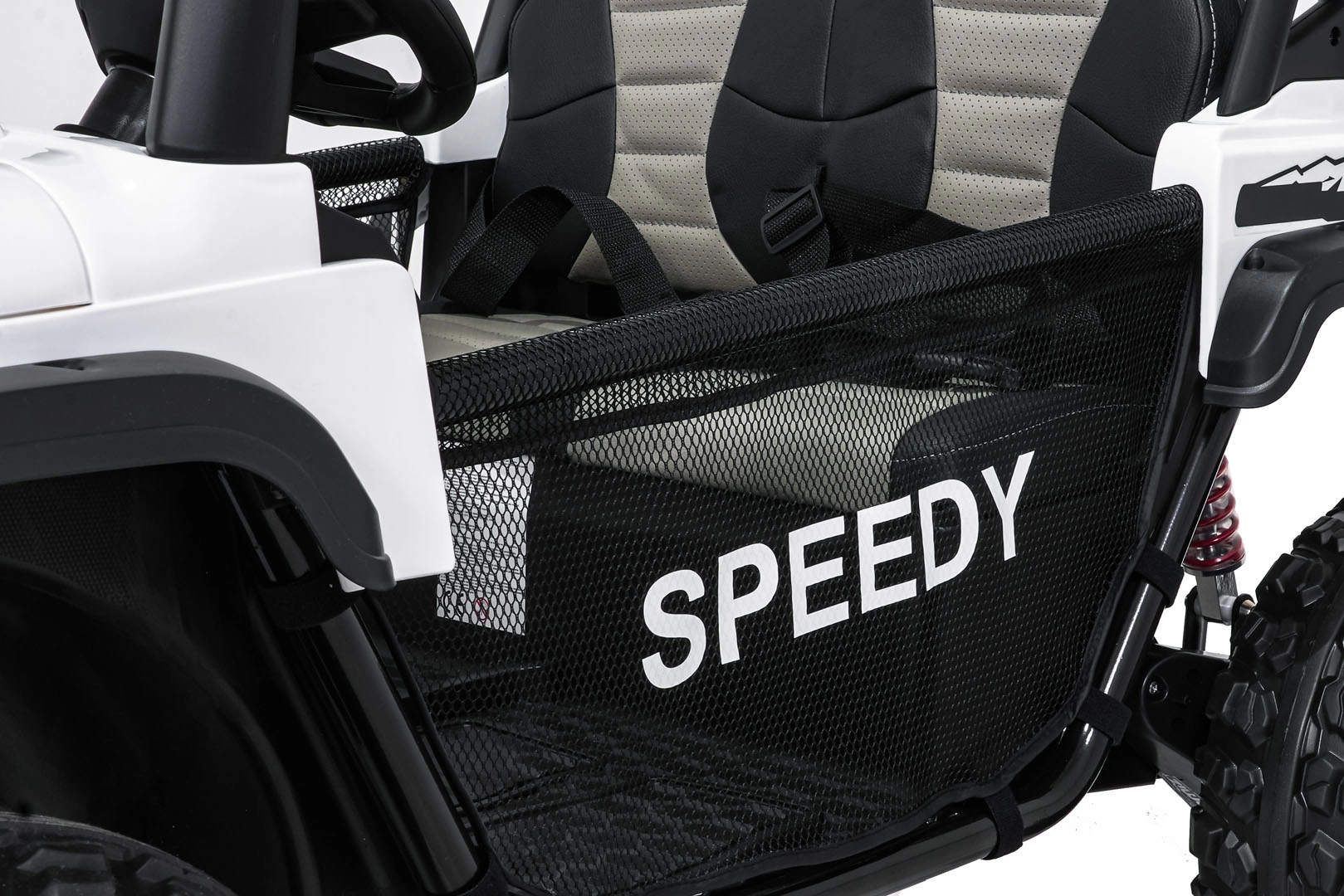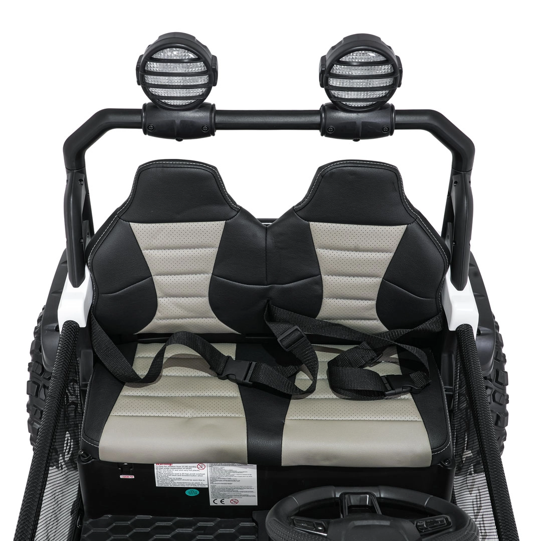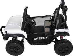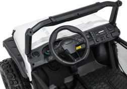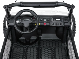 Mladé řidiče potěší bohatá výbava: multimediální panel s MP3/USB/AUX a Bluetooth, zvuky a klakson na volantu, LED přední světla a podsvětlená kapota. Rodiče ocení ovladač 2,4 GHz se 3 rychlostmi, plynulý start a bezpečnostní Stop. Dvoumístné sedadlo z ekokůže s pásy zvyšuje komfort a bezpečí.