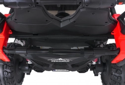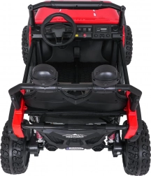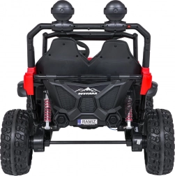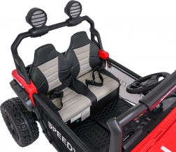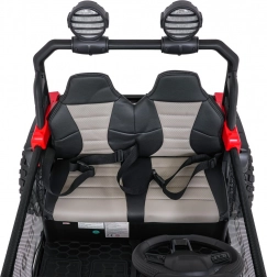 Široké dvoumístné sedadlo z ekokůže s bezpečnostními pásy (52×21×32 cm) zajistí pohodlí a jistotu. Rodič může kdykoliv převzít kontrolu přes ovladač 2,4 GHz s tlačítkem nouzového zastavení.