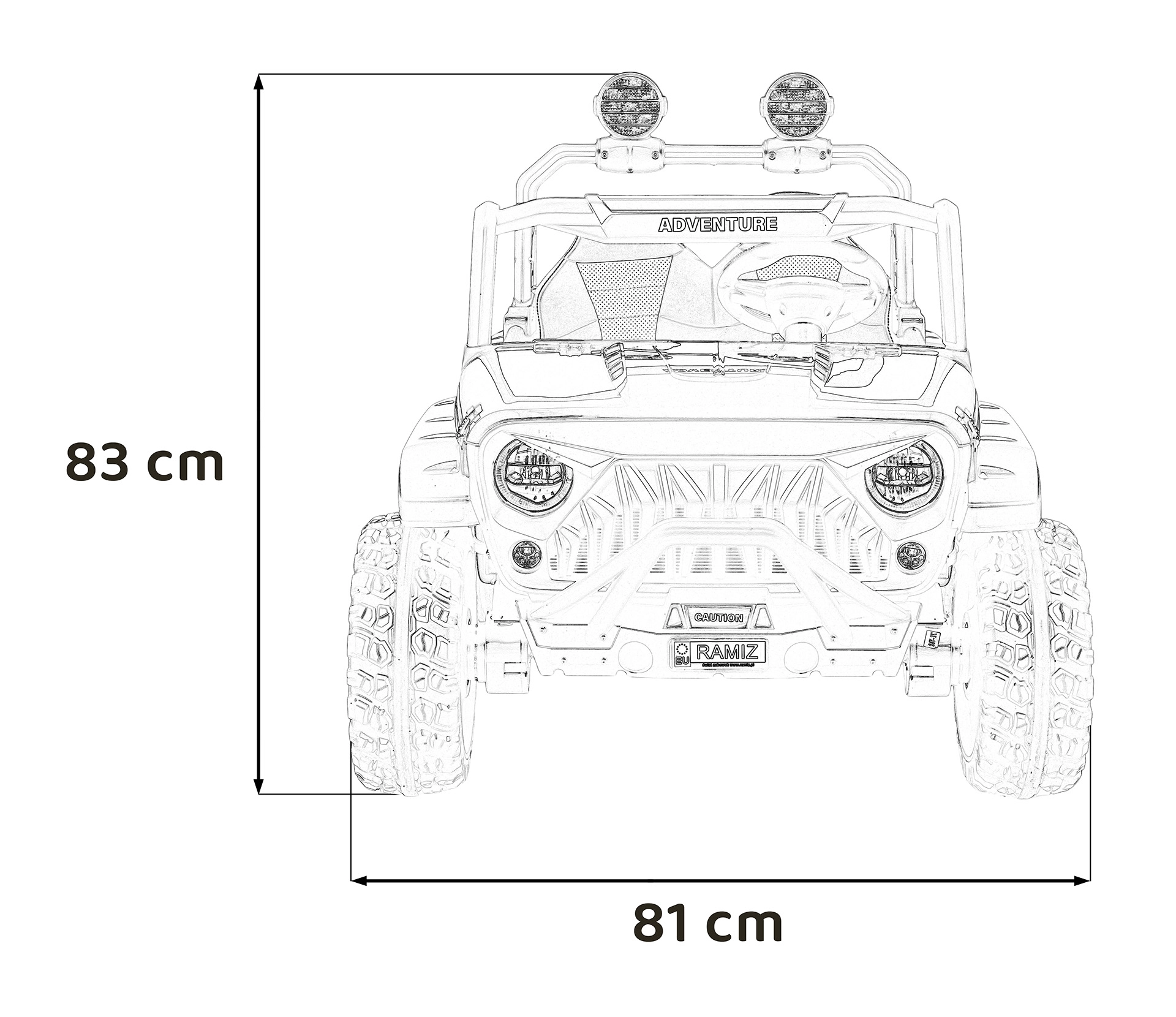 Rodiče ocení ovladač 2,4 GHz se třemi rychlostmi a bezpečnostním tlačítkem Stop. Děti se mohou vyřádit s hudbou – panel nabízí Bluetooth, MP3, USB i AUX, nechybí klakson a předinstalované melodie. Široká světelná výbava s LED světly, podsvícenou kapotou a přípravou pro horní světelný rám dodává autu dobrodružný vzhled.