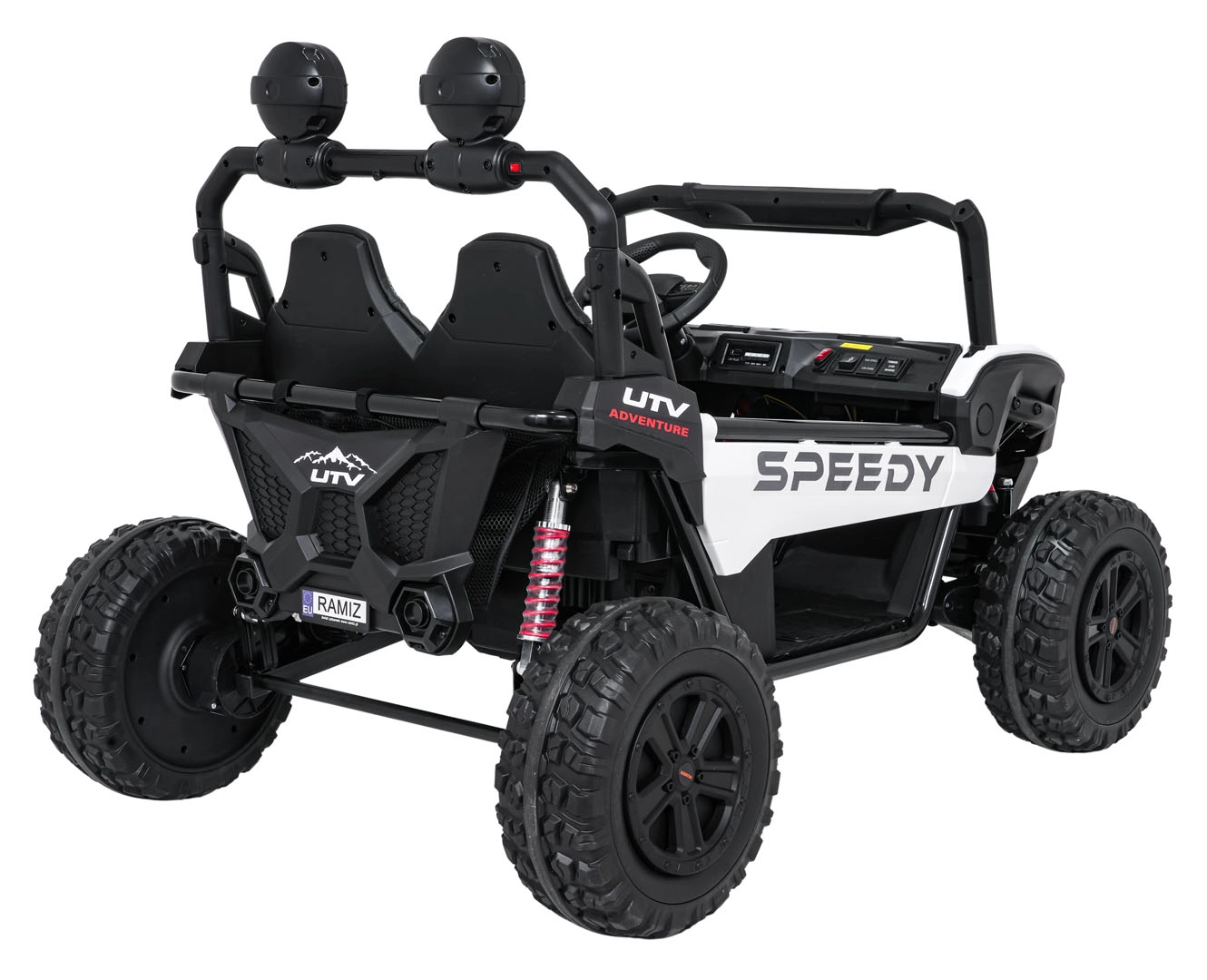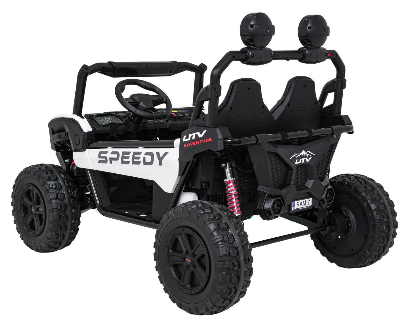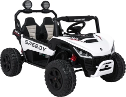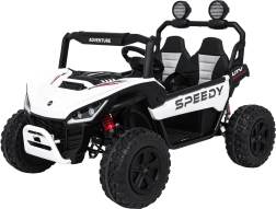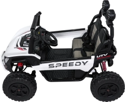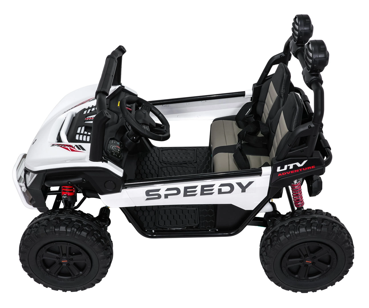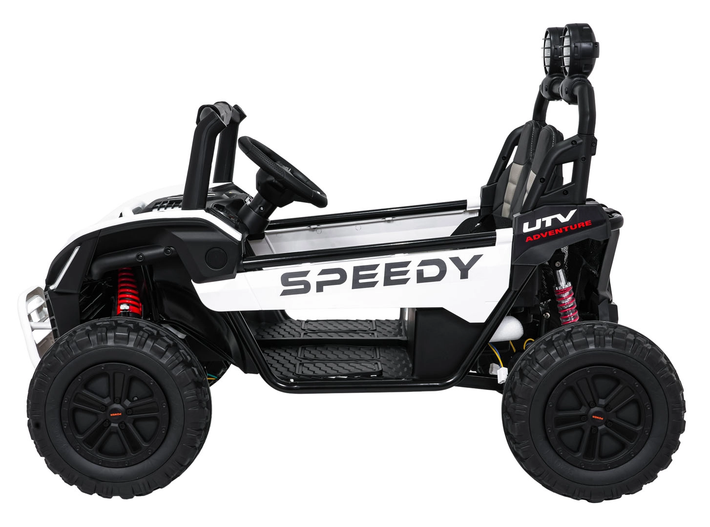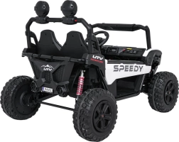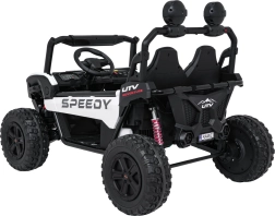Tato robustní dětská buggy SPEEDY přináší skutečné off-road dobrodružství. Čtyři silné motory 4×200 W napájené sadou 24 V (2×12 V 10 Ah) zajišťují plynulý rozjezd, dvě rychlosti a jízdu vpřed/vzad. Velká pěnová kola EVA (31×12 cm) společně se zadními nastavitelnými tlumiči a vysokým světlým podvozkem poskytují stabilitu, přilnavost a komfort na nerovnostech.