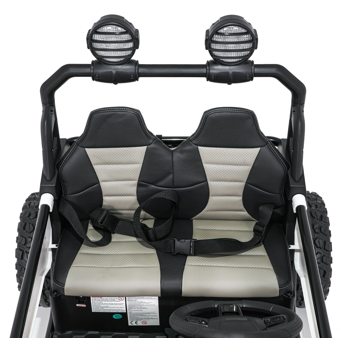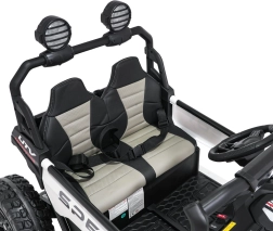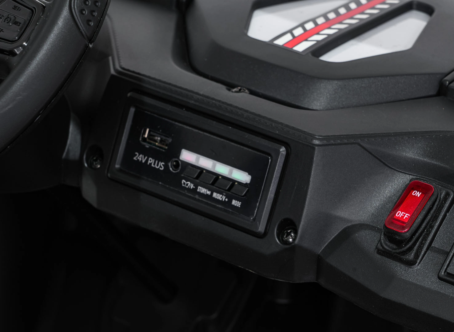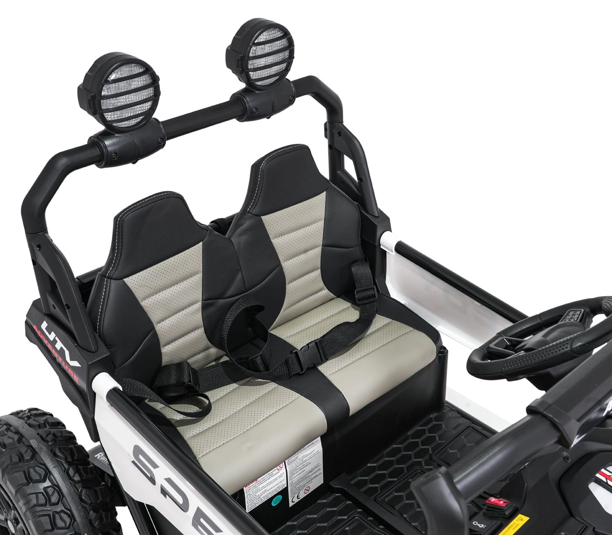 Bezpečnost a pohodlí jsou na prvním místě: prostorná dvojitá sedačka z ekokůže s pásy bezpečně usadí dvě děti, světlomet s LED efektem a podsvícená maska zvyšují viditelnost. Rodiče mají vše pod kontrolou díky 2,4GHz dálkovému ovladači se 3 rychlostmi a funkcí Emergency Stop. Audio panel nabídne MP3, AUX, USB i Bluetooth, včetně klaksonu a melodií na volantu.