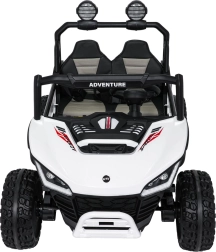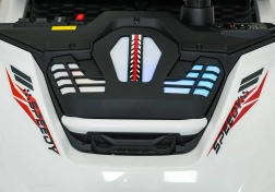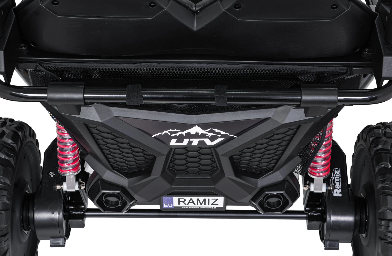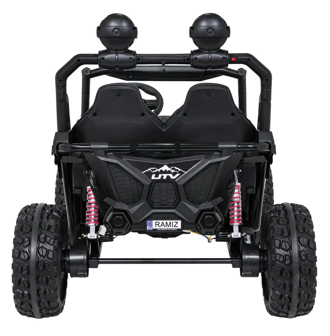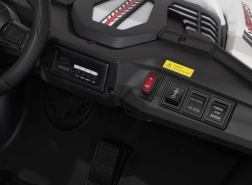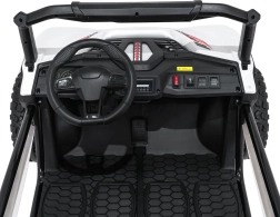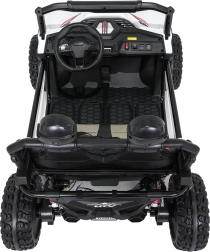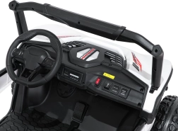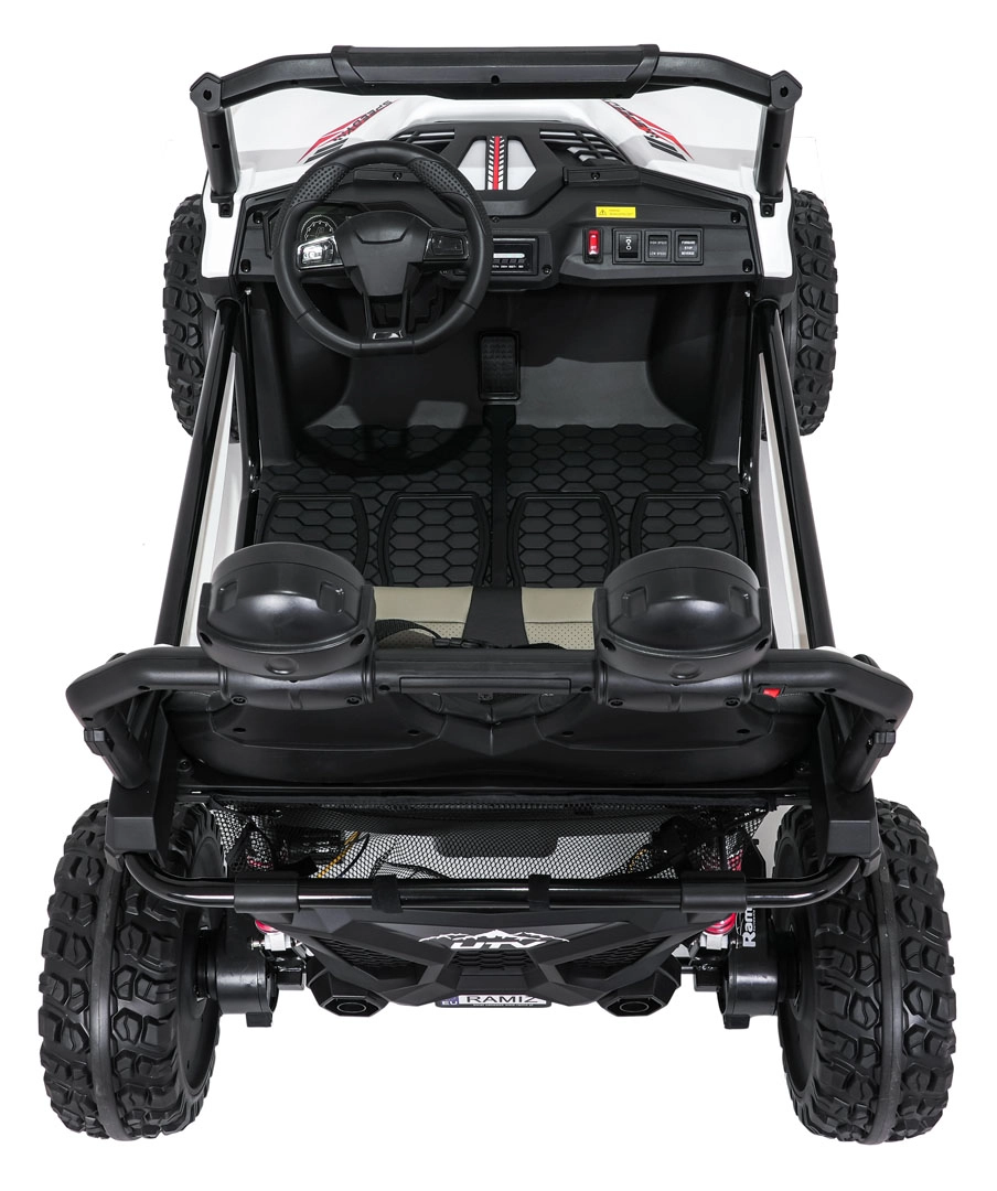 Bezpečnost a pohodlí jsou na prvním místě: prostorná dvojitá sedačka z ekokůže s pásy bezpečně usadí dvě děti, světlomet s LED efektem a podsvícená maska zvyšují viditelnost. Rodiče mají vše pod kontrolou díky 2,4GHz dálkovému ovladači se 3 rychlostmi a funkcí Emergency Stop. Audio panel nabídne MP3, AUX, USB i Bluetooth, včetně klaksonu a melodií na volantu.