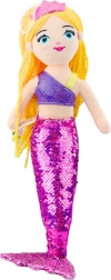 Plyšová mořská panna má dlouhé, žluté kadeřavé vlasy a růžovou korunu. Fialový třpytivý top dotváří estetickou a pohádkovou postavu, která je ideální nejen jako hračka, ale také jako dekorace do dětského pokoje.
