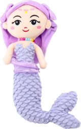 Mořská panna má elegantně vyšívanou tvář a drobné zlaté a růžové akcenty na čele s usměvavými očky. Světle fialové vlasy jsou ozdobeny látkovou čelenkou s mašlemi po stranách a na krku je barevný náhrdelník z korálků. Celý design působí jemně a bajkově.