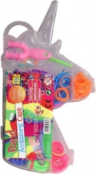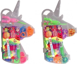 Vše je úhledně baleno v praktické plastové krabičce ve tvaru jednorožce, která obsahuje menší oddělené boxíky pro přehledné uspořádání gumiček podle barev. Tato sada je nejenom zábavná, ale také rozvíjí dětskou kreativitu a jemnou motoriku.