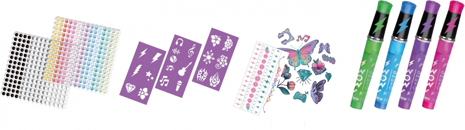 Třpytivé propisky, šablony, drahokamy, dočasná tetování