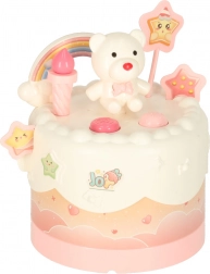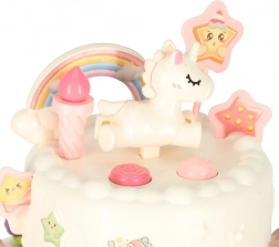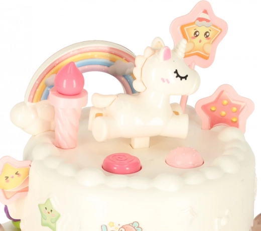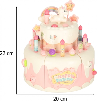 Dvoupatrový narozeninový dort vyrobený z kvalitního plastu je ideální hračkou pro děti nad 3 roky. Rozvíjí dětskou kreativitu a jemnou motoriku díky interaktivním prvkům, jako je otáčení a hudební efekty. Součástí sady jsou roztomilé figurky medvídka a jednorožce, šest svíček a další příslušenství.