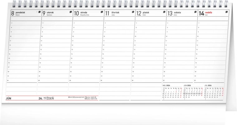 Stolní kalendář pro manažery se sloupcovým kalendáriem, který obsahuje všechny daňové termíny, slovenská jména, svátky a památné dny a tříměsíční přehled pro každý týden.
