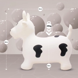 Objevte skákací kravičku s bíločernými skvrnami, ideální pro uvolnění energie, rozvoj pohybové koordinace a posílení svalů nohou. Pro děti od 12 měsíců a s maximální nosností 45 kg. Tato kravička je perfektní hračkou pro vnitřní i venkovní hraní.