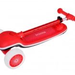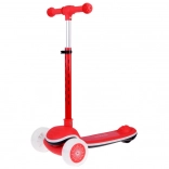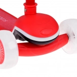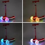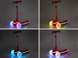 Koloběžka je navržená pro první jízdy a rozvoj rovnováhy. Dvojitá přední kolečka a široká platforma zvyšují stabilitu, zatímco výškově nastavitelná řídítka se přizpůsobí růstu dítěte. Barevné LED diody ve kolech a rámu rozzáří každou vyjížďku – s možností volby až 20 světelných režimů a 4 hudebních módů.