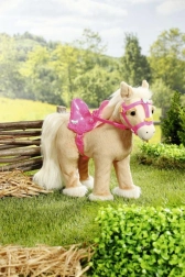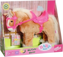 Užijte si zábavu s BABY born Můj chodící koník, který nadšeně řehtá a pohybuje se. Stačí stisknout jeho pravé ucho, aby začal vydávat zvuky, a levé, aby se dal do pohybu. Koník nejraději běhá na rovném a hladkém povrchu, přičemž slyšíte klapot jeho kopyt.