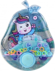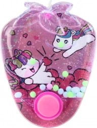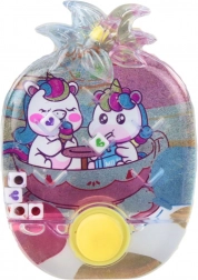 Tato vodní hra s motivem kouzelných jednorožců je klasickou hračkou, která již mnoho let přináší radost dětem různého věku. Díky kompaktním rozměrům a jednoduchému mechanizmu je ideální na cesty, do školy nebo na procházku. Hra spočívá ve stisknutí tlačítka, které uvede do pohybu barevné kroužky nebo kuličky uvnitř průhledné nádobky plné tekutiny. Cílem je umístit tyto prvky na kolíky nebo do určených míst.