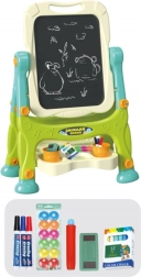 Edukační oboustranná tabule je vybavena funkcí rotace o 360°, což umožňuje rychlou změnu pracovní plochy bez nutnosti demontáže. Její výška je přizpůsobena potřebám dětí a stabilitu zajišťuje pevný stojan se širokou základnou. Praktická police s barevnými kontejnery pomáhá udržet pořádek v pomůckách na kreslení.