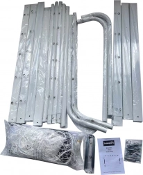 V balení naleznete kovové konstrukční profily, síť, 7 kotvících kolíků, montážní šňůrku, šrouby, klíč, imbus a polský návod.