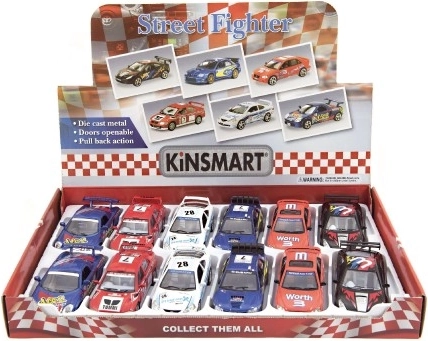 Objevte svět rychlosti a zábavy s mini závodními autíčky KINSMART Street Fighter. Kovová karoserie s plastovými doplňky zajišťuje odolnost a zároveň precizní zpracování detailů, jako jsou závodní polepy, spoilery a sportovní disky.
