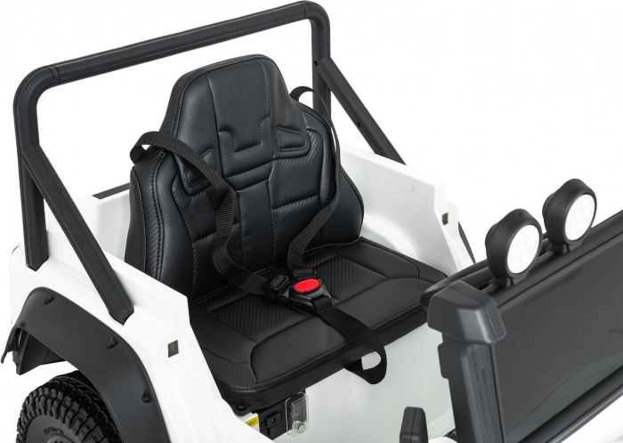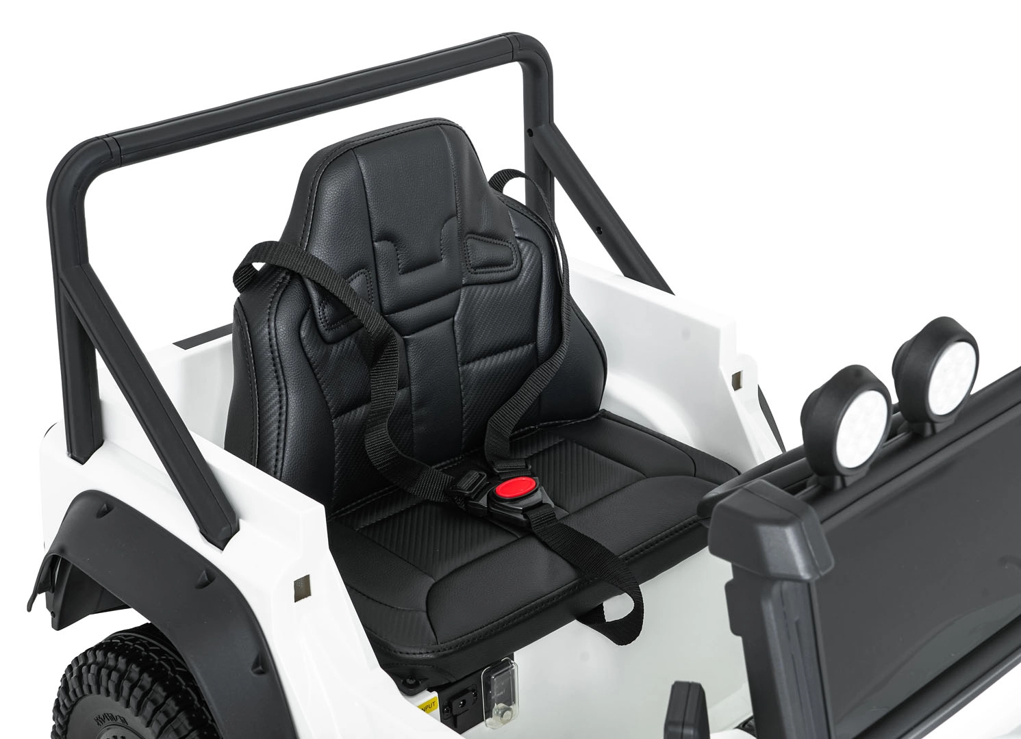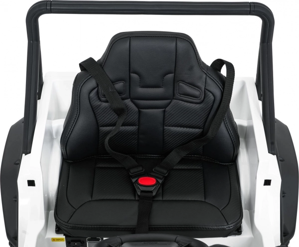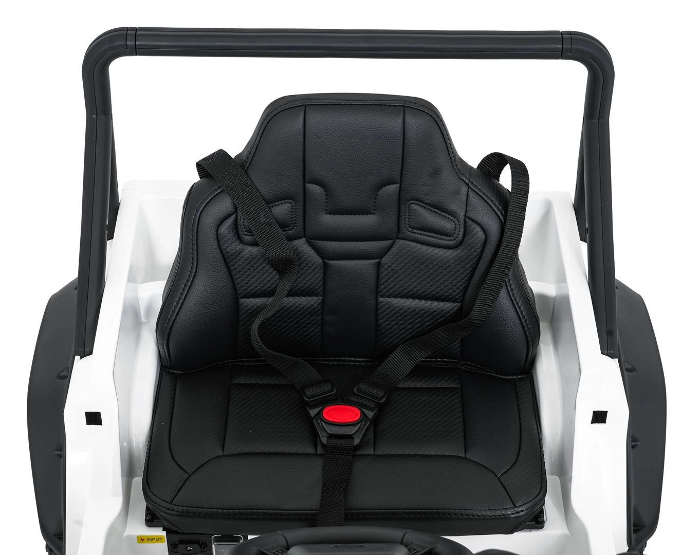 - Bezpečnost: dálkové ovládání 2,4 GHz, 3 rychlosti, nouzové tlačítko Stop, bezpečnostní pásy