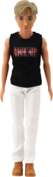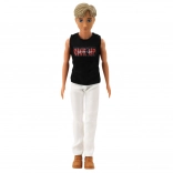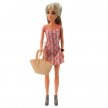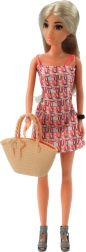 Dívka má na sobě červené šaty s geometrickým vzorem a šedé sandále na klínku. Její dlouhé blond vlasy lze česat a upravovat. Stylizaci doplňuje slaměná kabelka a bílý klobouk se širokým okrajem - ideální na slunečné dny. Chlapec je oblečen do černého trička bez rukávů s potiskem, bílých kalhot a hnědých bot, což vytváří módní letní outfit.