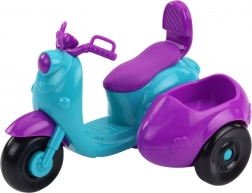 Panenka jezdí na tříkolovém skútru v intenzivní tyrkysovo-fialové barvě. Přívěs na boku skútru skrývá malého psa s červeným obojkem – věrného společníka na každé cestě. Set je vyroben z odolného, bezpečného plastu, ideálního pro každodenní hraní.