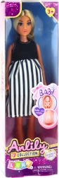 Loutka Anlily Těhotná je skvělou volbou pro hraní realistických rodinných scénářů. Obléknuta v elegantních černo-bílých pruhovaných šatech a s viditelným bříškem, je ideální pro rozvoj dětské představivosti a empatie.