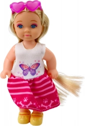 Tento rozkošný set přenese děti do světa starostlivé péče a hravé zábavy s domácími mazlíčky. Panenka o výšce 12 cm je oblečena v pestrobarevném outfitu: bílé tričko s motýlím potiskem, růžovou sukýnku s motivem tlapek a žluté boty. Panenka má na hlavě růžové brýle ve tvaru srdíček, které jí dodávají výrazný charakter.