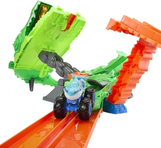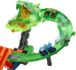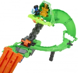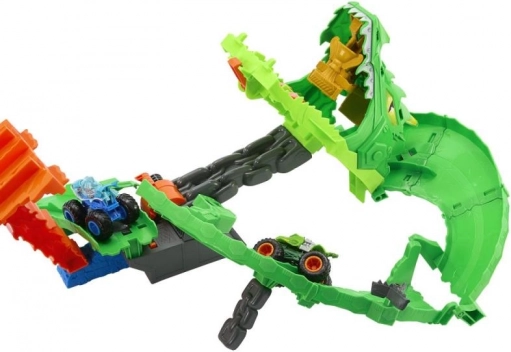 Rozjeď adrenalinový souboj v tematické sadě „Rekiny vs. Dinosauři: Dračí závod“. Vlož oba trucky do dvojitého vystřelovače a pošli je rovnoběžným závodem přímo do tlamy kybernetického draka. O všem rozhodne výhybka ve tvaru pily, která náhodně určí, zda se vozy zastaví, jeden spadne z trati, nebo oba prolétnou a srazí draka k zemi.