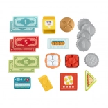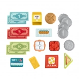 Součástí jsou bankovky, mince, platební karta a plastové potraviny – vše pro kompletní scénáře nakupování, markování i placení.