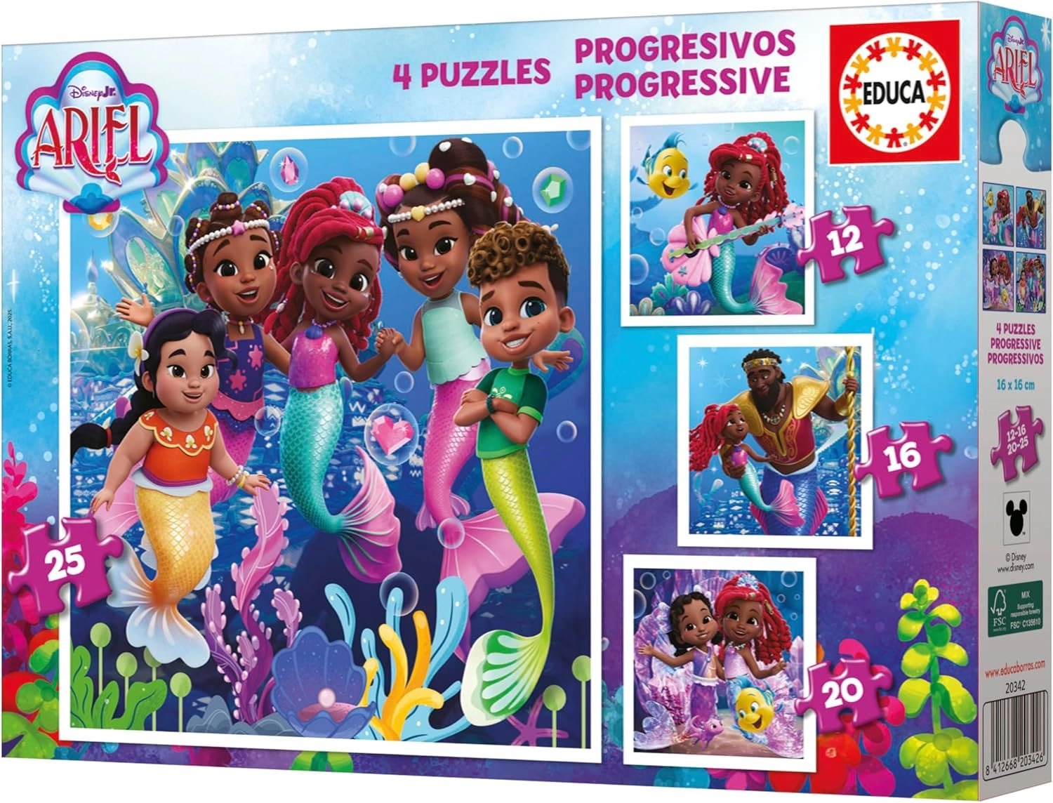 Objevte kouzlo podmořského světa s puzzle Disney Ariel. Tento set obsahuje čtyři progresivní puzzle s různou obtížností a různě velkými dílky, ideální pro malé i větší děti.
