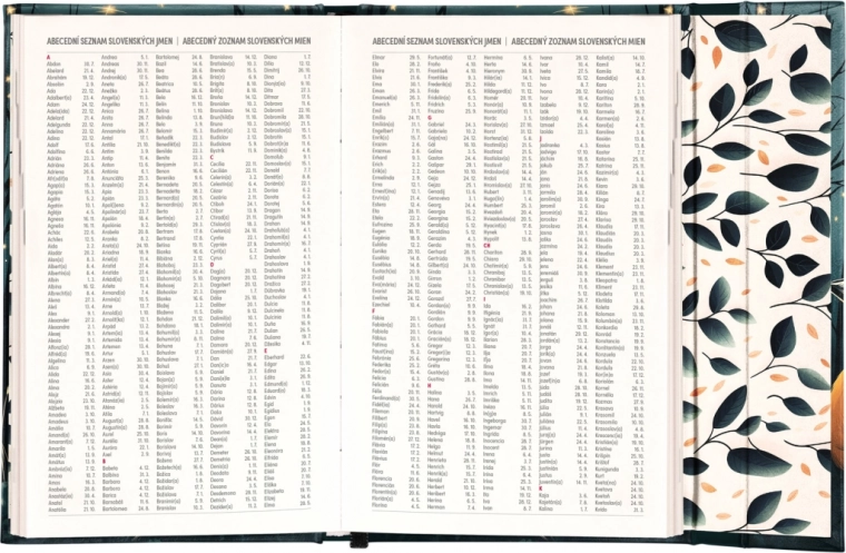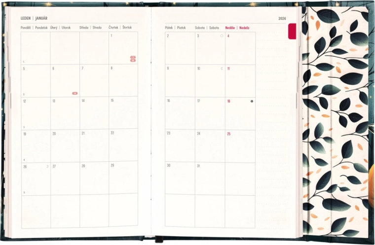 Je vybaven měsíčními přehledy, které umožňují snadnější plánování delších časových úseků jako jsou dovolené nebo školní prázdniny. Tento diář obsahuje také seznam českých a slovenských svátků a jmenin, což umožňuje lepší organizaci volného času.