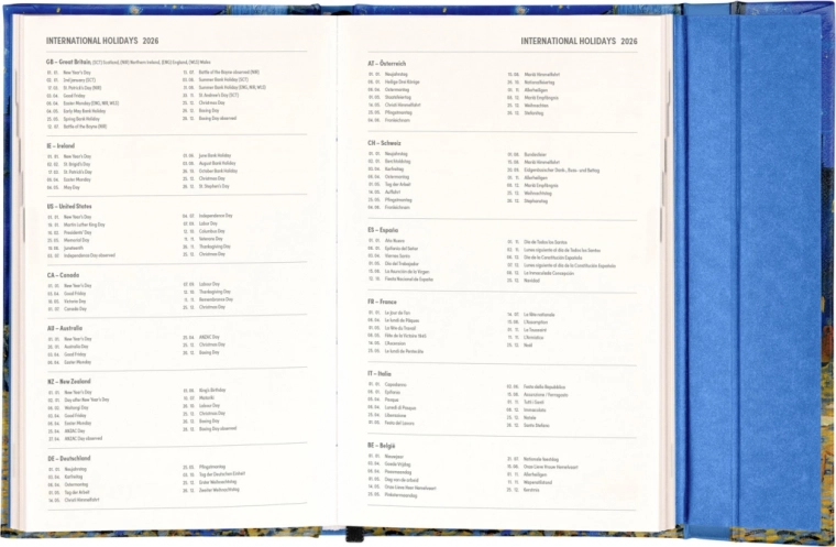 Diář je dostupný v rozměru 13 x 21 cm, což je ideální velikost do tašky či batohu. Zahrnuje také mezinárodní svátky, což je užitečné pro uživatele, kteří často cestují nebo mají mezinárodní klientelu.