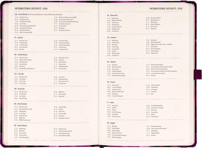 - Polovina s čtrnáctidenním horizontálním kalendáriem obsahuje i mezinárodní svátky.