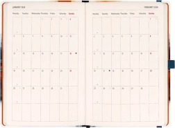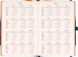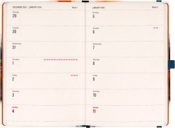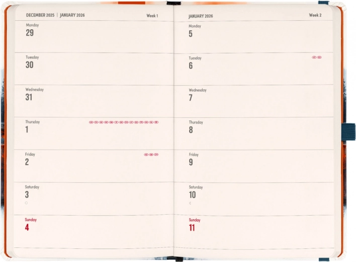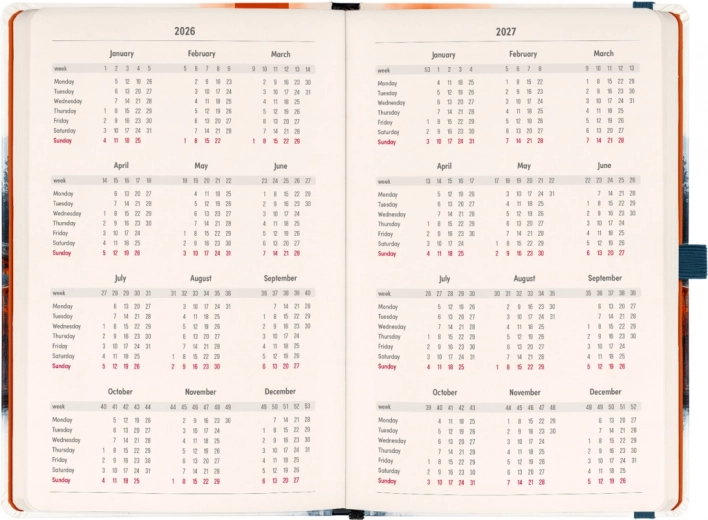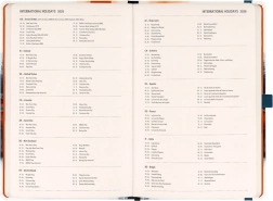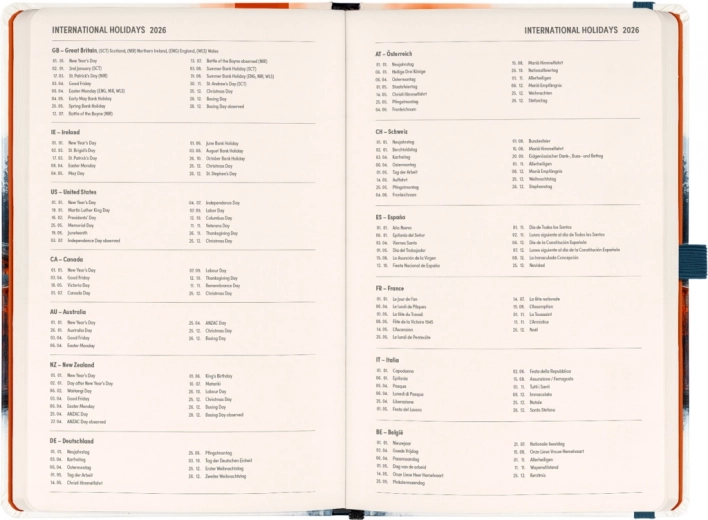 - Diář část: Čtrnáctidenní horizontální kalendárium s mezinárodními svátky.