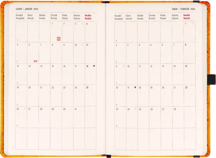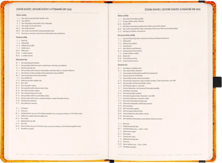 - Čtrnáctidenní horizontální kalendárium s českými a slovenskými svátky pro snadné plánování.