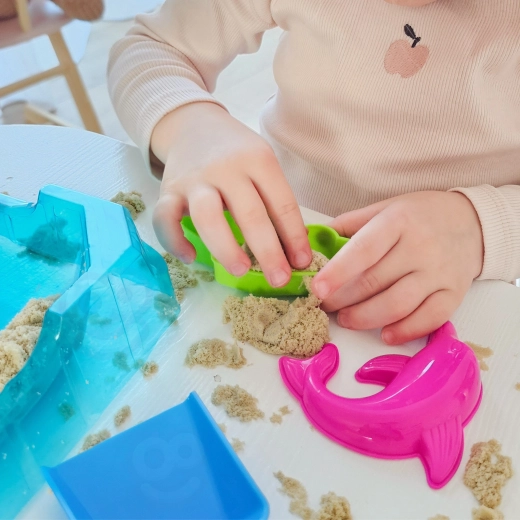 Kinetický písek je měkký, příjemný na dotek, dobře drží tvar, nevysychá a nelepí se na ruce – ideální pro smyslovou hru dětí od 3 let.