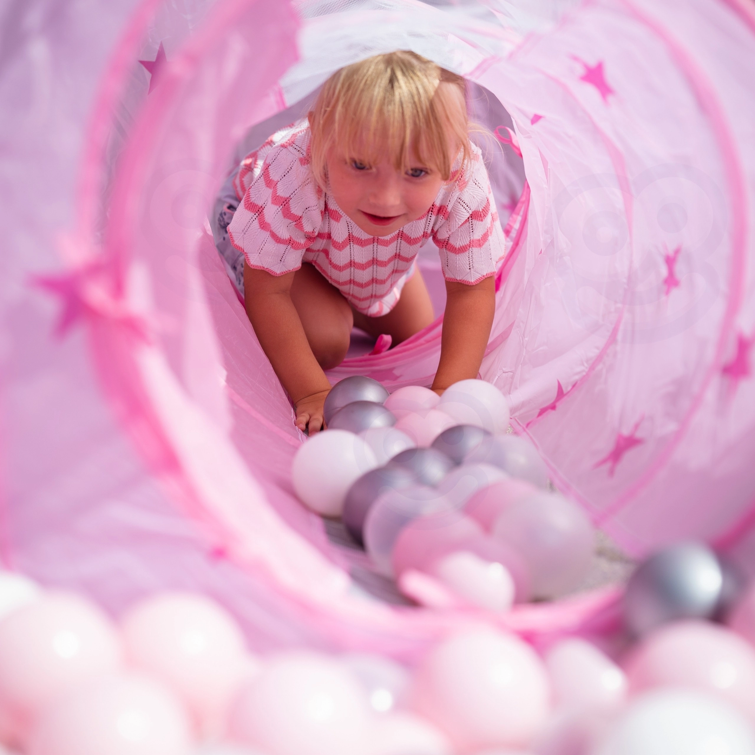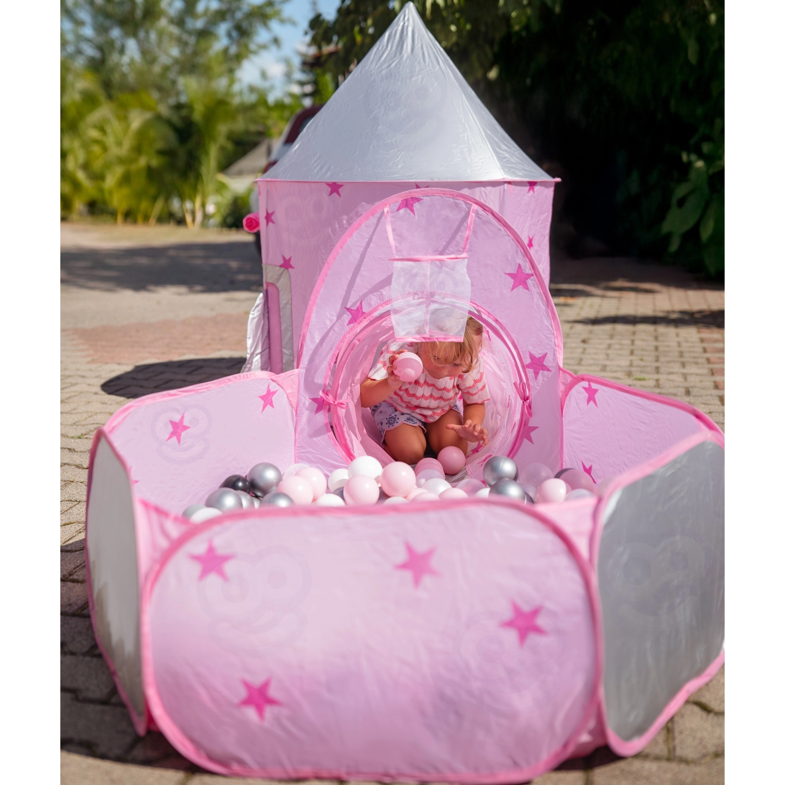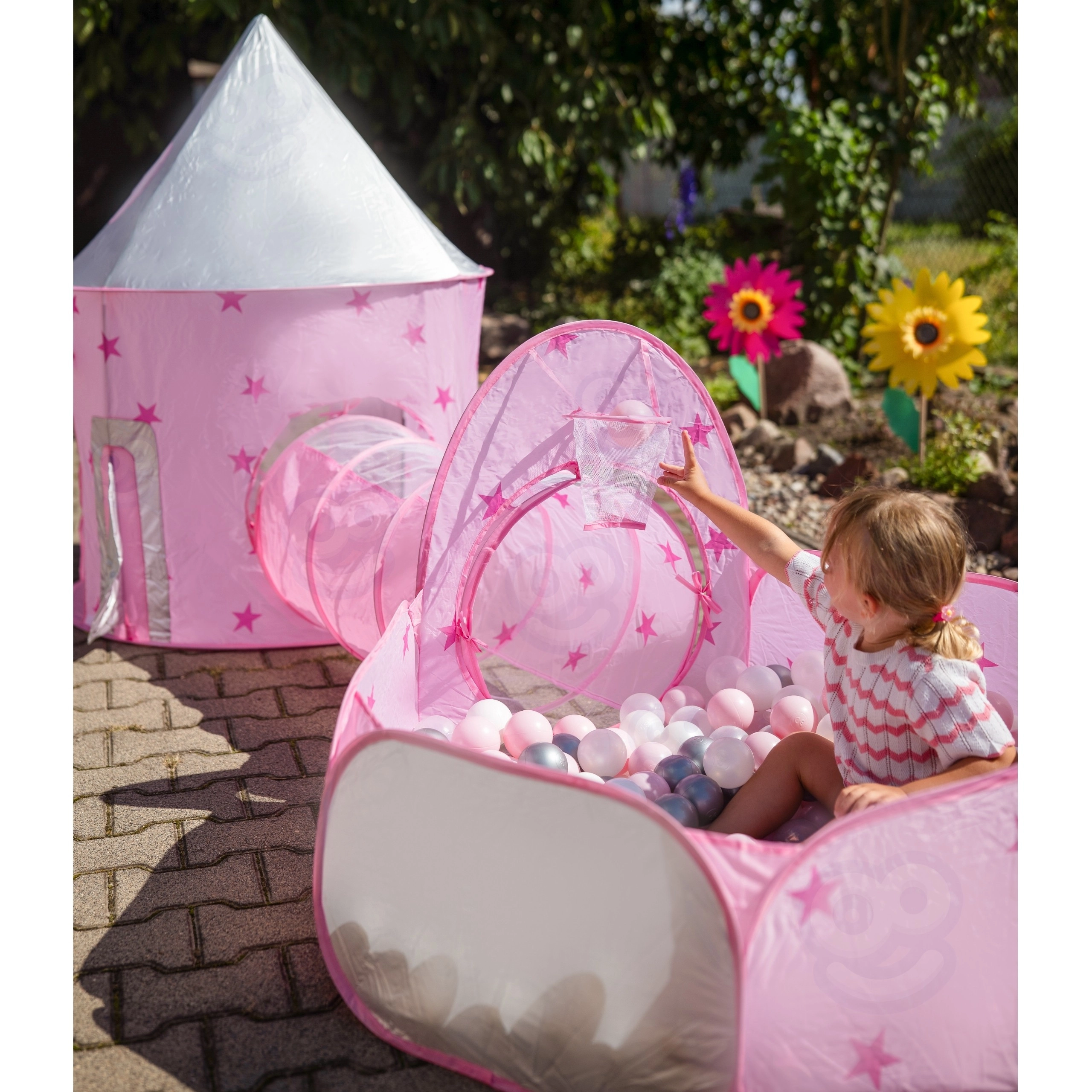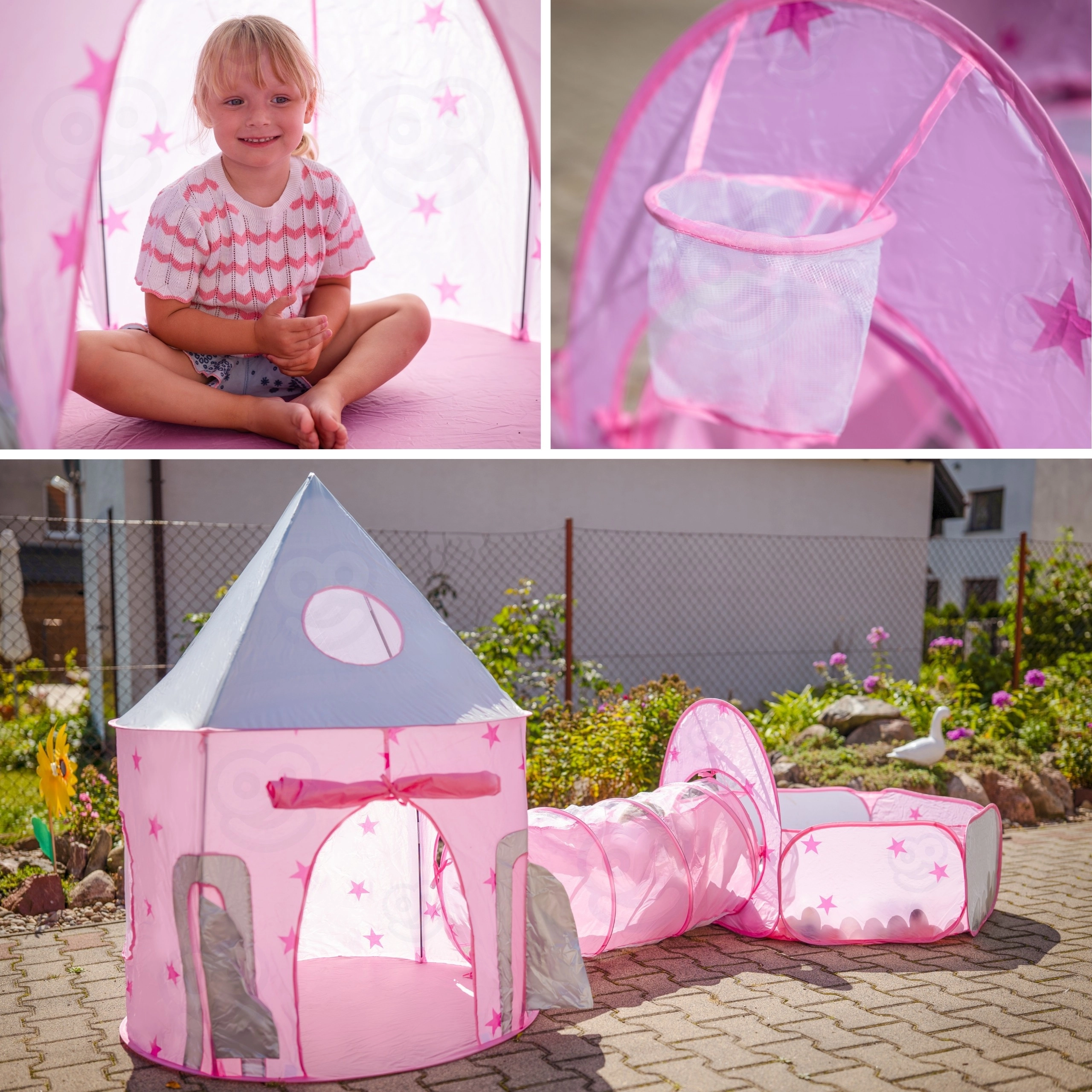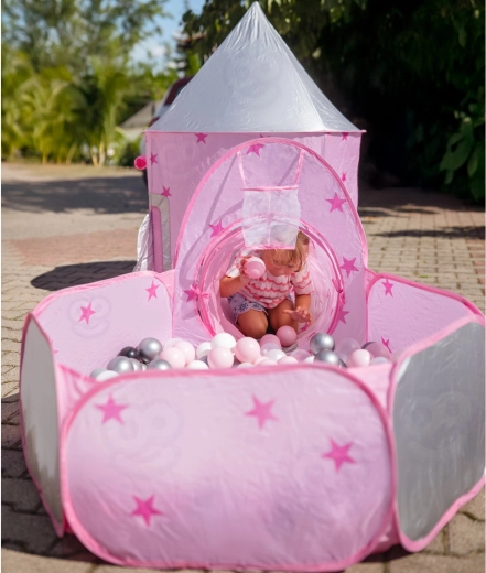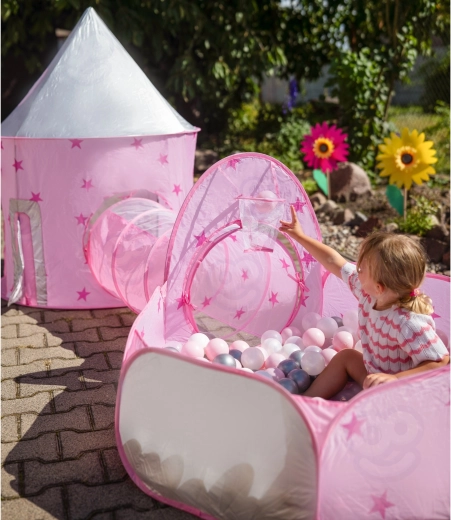 Dominantou setu je růžový stan připomínající palác, s okénky ze síťoviny a rolovacími dvířky. Perfektní skrýš pro malé princezny i rytíře a centrum jejich fantazijních her.