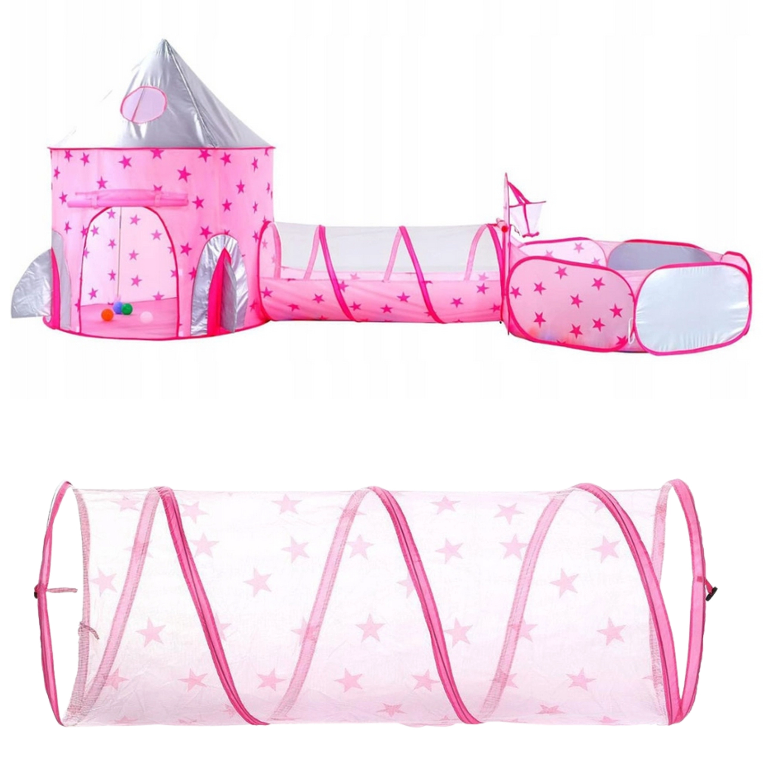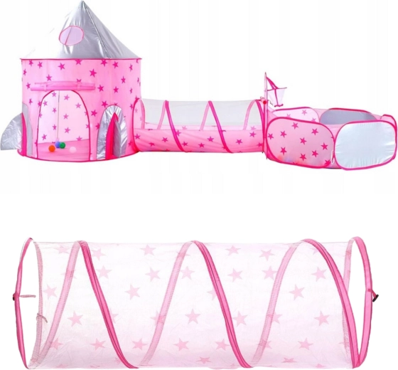 Růžový hrací set 3v1 od značky Woopie promění každý pokoj i zahradu v pohádkové království. Obsahuje stan ve tvaru zámku, propojovací tunel a prostorný suchý bazének. Díky pop-up konstrukci se snadno rozkládá i skládá a je ideální pro aktivní hraní, rozvoj fantazie a společnou zábavu. Lehký, skládací, větraný síťovinou a skvělý pro vnitřní i venkovní použití.