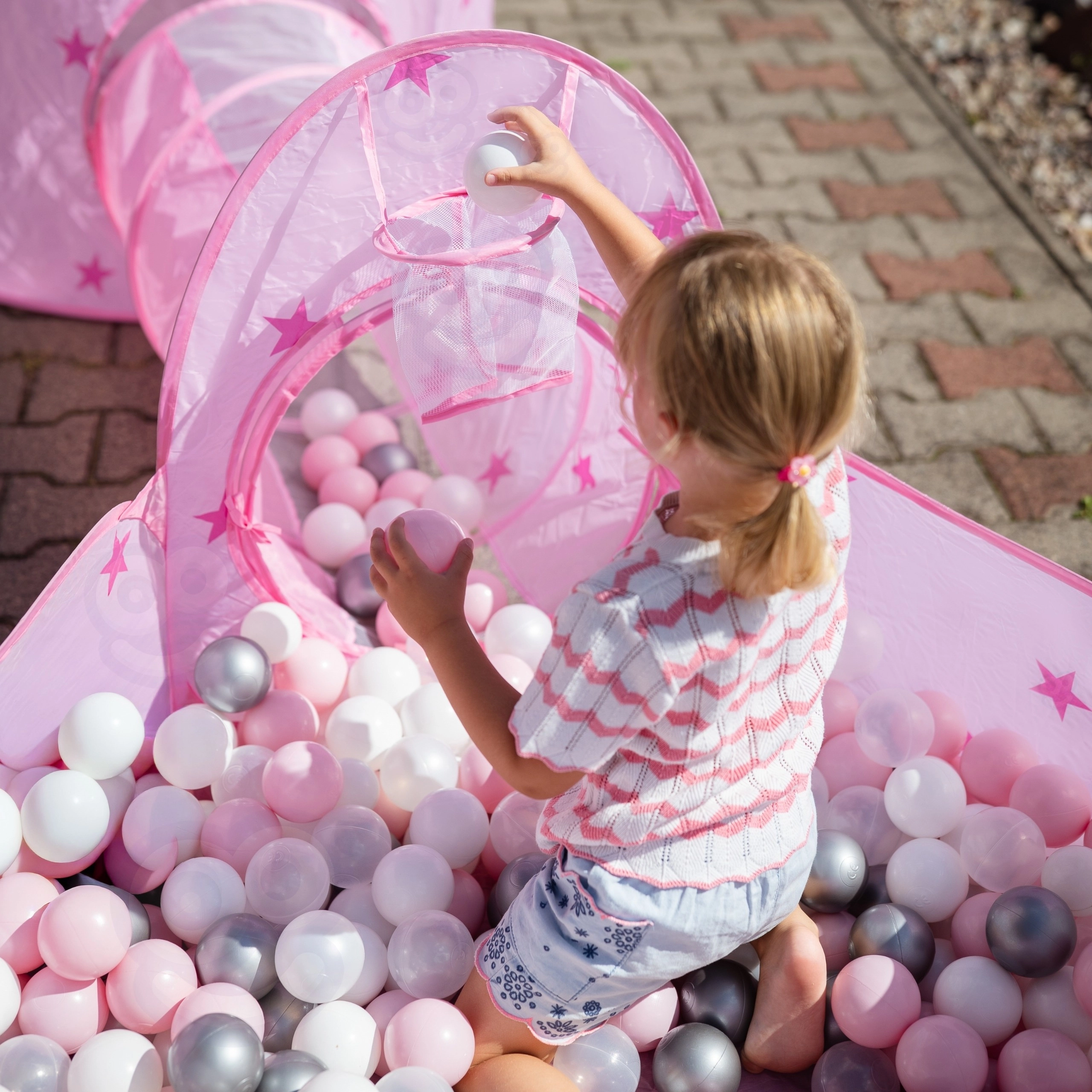 Prostorný ohraničený bazének s větranými stěnami je ideální pro hru s plastovými míčky. Integrovaný koš/terč zvyšuje zábavu házením a tříděním míčků. Míčky nejsou součástí balení.