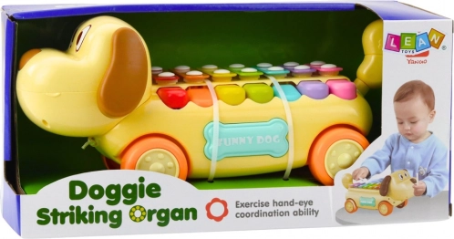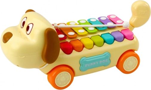 Jezdící pejsek je vybaven úplnou škálou barevných činelek, které můžete rozezvučet přiloženou paličkou. Díky připevnění paličky ke hračce na šňůrce je zabráněno její ztrátě i během intenzivní hry. Pejsek je vyroben z odolných a bezpečných materiálů, jeho konstrukce podporuje rozvoj koordinace ruka-oko, jemné motoriky a hudební citlivosti. Ideální jako vzdělávací hračka pro děti od 18 měsíců.