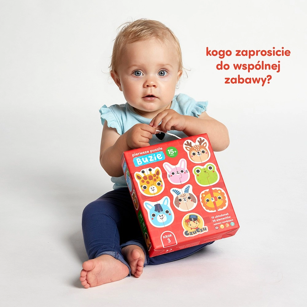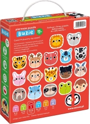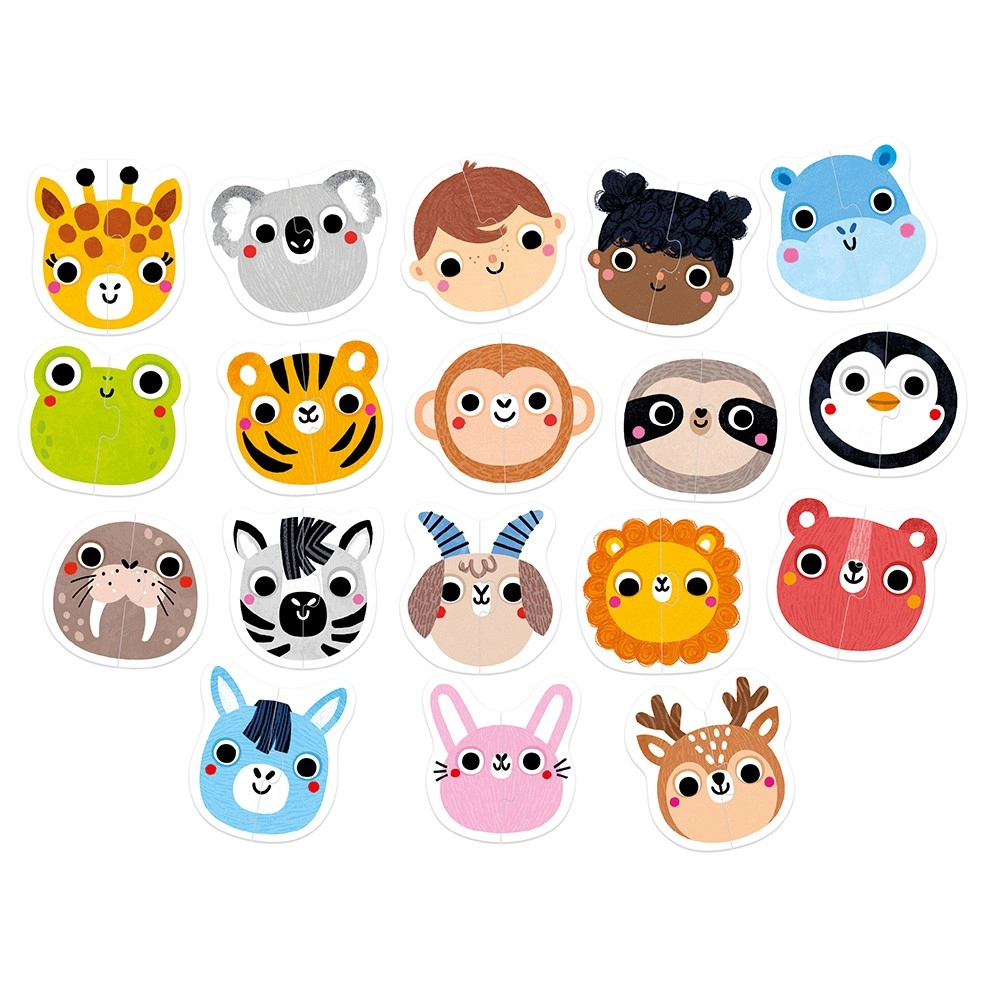 Co najdete v krabici? Až 18 dvoudílných puzzlí s obličeji zvířátek a 2 dětských obličejů, což dává vašim nejmenším mnoho možností k zábavné hře!