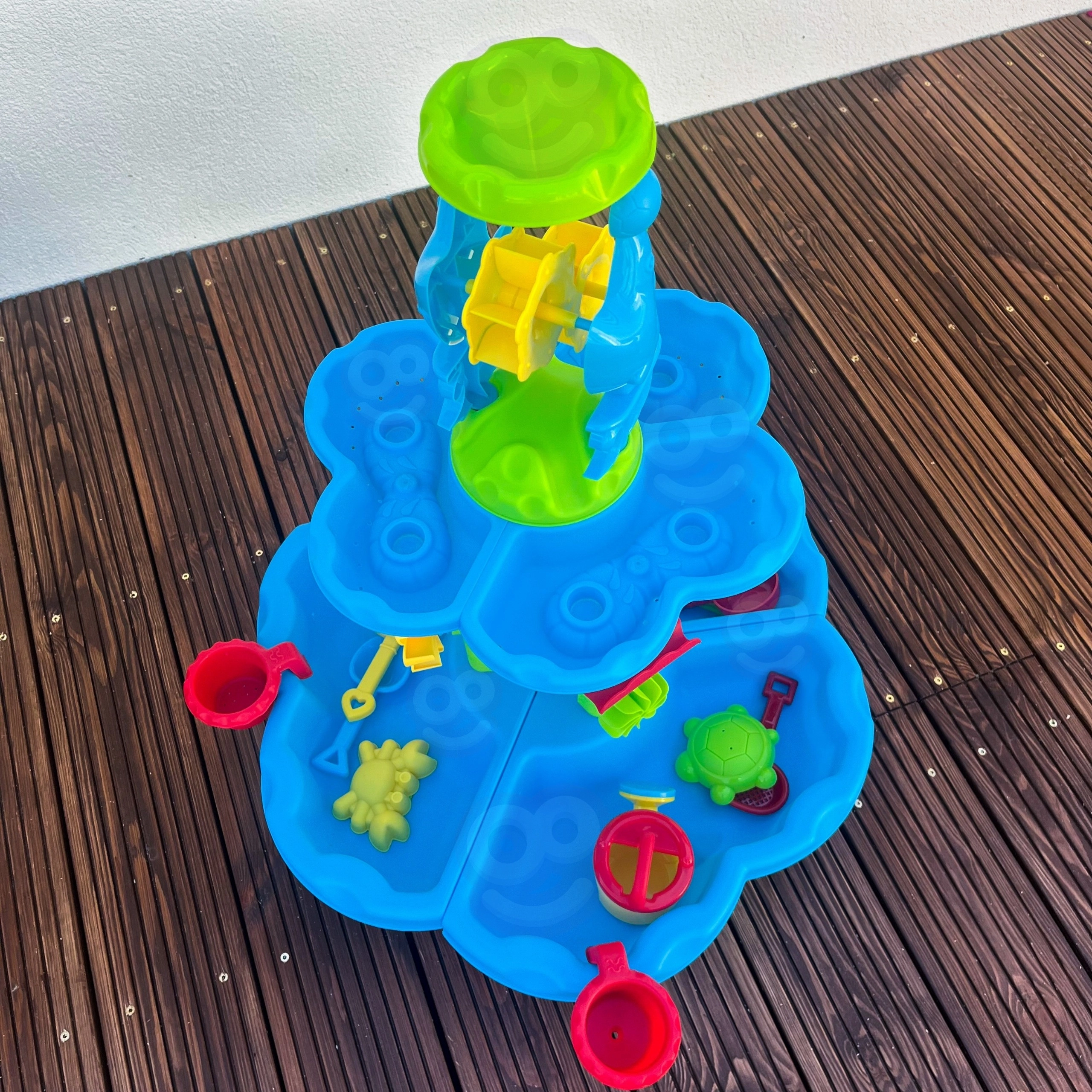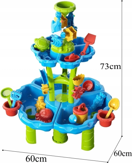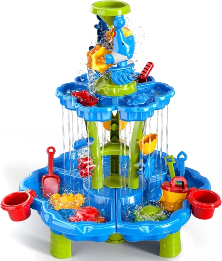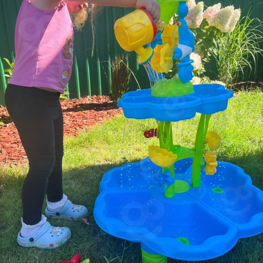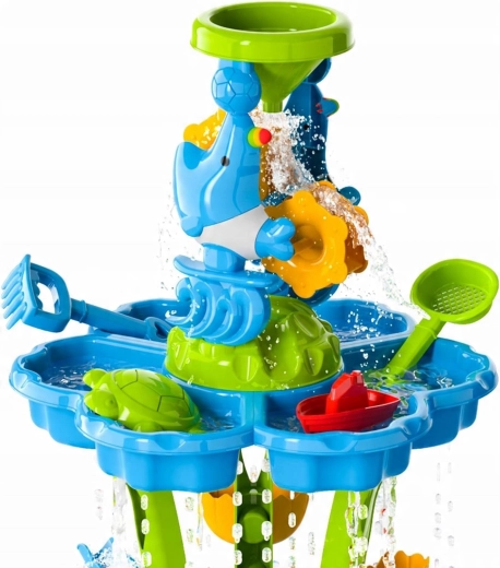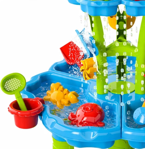 Vytvořte dětem jejich vlastní mini aquapark. Stolek nabízí tři samostatné komory – jednu můžete naplnit vodou, druhou pískem a třetí nechat na míchání a experimenty. Voda stéká přes kaskádové žlaby, roztáčí kola a přepadá přes branky, takže děti vidí jasné příčinné souvislosti a rozvíjejí jemnou motoriku.