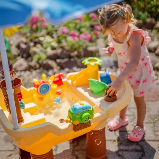Velký vodní stůl Woopie v designu pirátské lodi promění zahradu v záliv plný objevů. Děti mohou nalévat vodu, spouštět vodní kola, stříkat z kanónu, tvořit bubliny a řídit loď pomocí pirátské věže a kormidla. Integrovaný sluneční deštník zajistí stín i v horkých dnech, takže hraní je pohodlné a bezpečné.