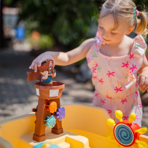 Věž s pirátem, kormidlo, kotva a vodní skluz vytvářejí autentický pirátský svět. Děti nalévají vodu do trychtýřů, roztáčejí kola a spouštějí vodní cesty.