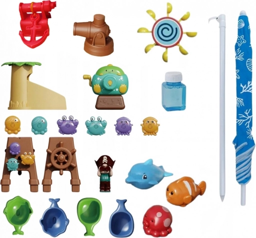 - vodní stůl, vodní kanón, výrobník bublin, vodní skluz, kotva, stožár s rozhlednou, figurka piráta, 6 malých vodních kol, 1 velké vodní kolo, 3 plovoucí zvířátka, 4 kelímky na přelévání, deštník