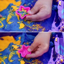 Děti mohou mačkat, krájet a tvarovat písek do hvězdiček a dalších motivů. Skvělé pro smyslové hraní a rozvoj jemné motoriky.