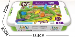 Kinetický písek (více barev), přenosný box/vanička s víkem, zvířecí formičky, lopatka, hrábě, modelovací tyčinky