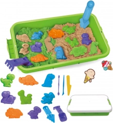 Součástí balení jsou různé zvířecí formičky, lopatky, hrábky a modelovací tyčinky, které podporují rozvoj představivosti, koordinace oko–ruka a soustředění. Díky uzavíratelnému boxu je hra přenosná a uklizená – písek i doplňky snadno uložíte a vezmete kamkoli.