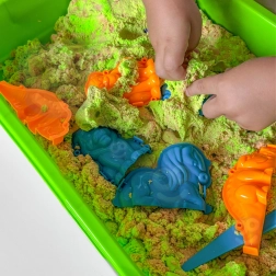 Kinetický písek je příjemně měkký, drží tvar, nelepí se na ruce a poskytuje uklidňující smyslový zážitek při hnětení a lisování.
