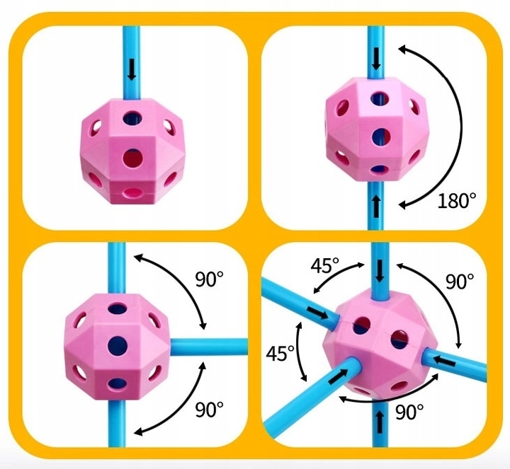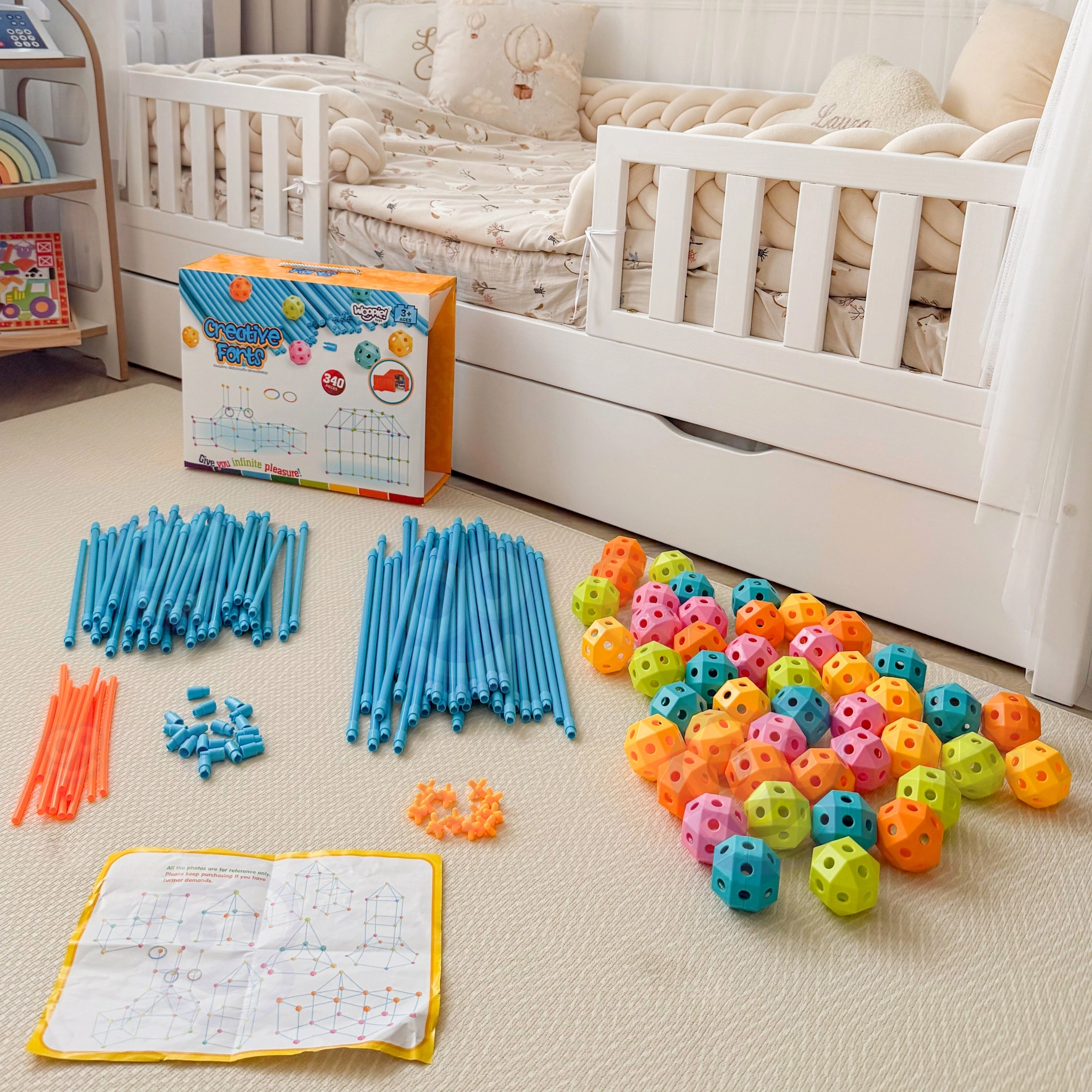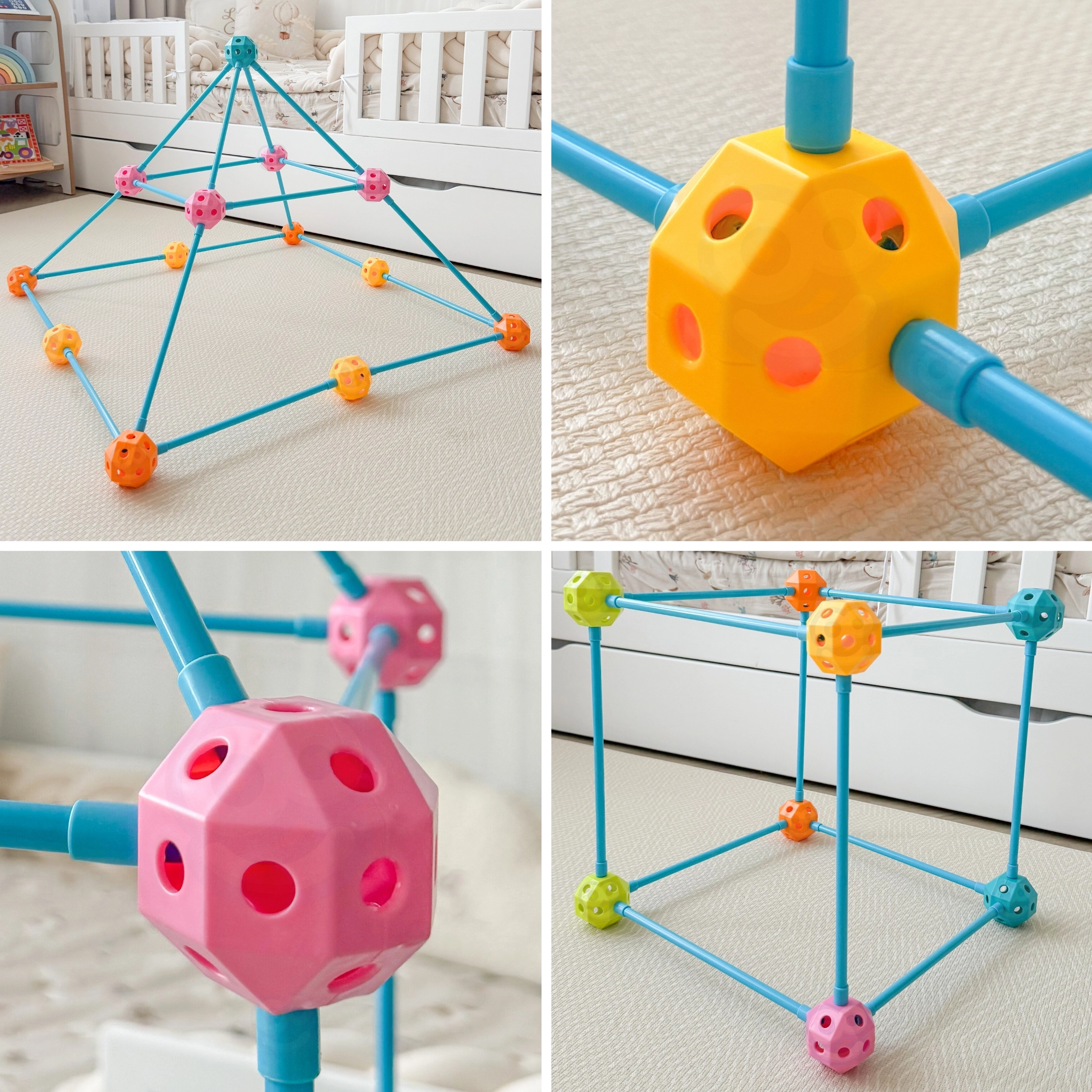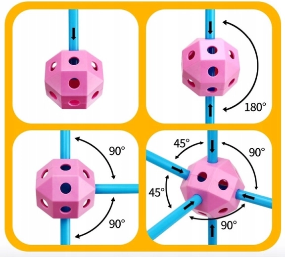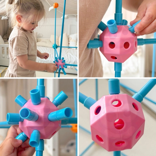 Dlouhé tyčky a víceotvorové kuličky umožňují pevná spojení v různých úhlech. Děti snadno vytvoří věže, kupole, domky i labyrinty.