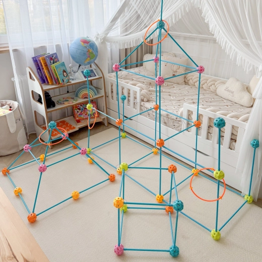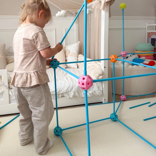 Stavebnice WOOPIE přináší dětem roli malých architektů. Modré tyčky a barevné kuličkové konektory s otvory pro více úhlů (45°, 90°, 180°) umožňují stavět stabilní i nápadité 3D tvary. Překryjte konstrukci plachtou a během chvilky vznikne útulný bunkr pro hraní i odpočinek.